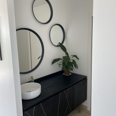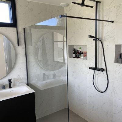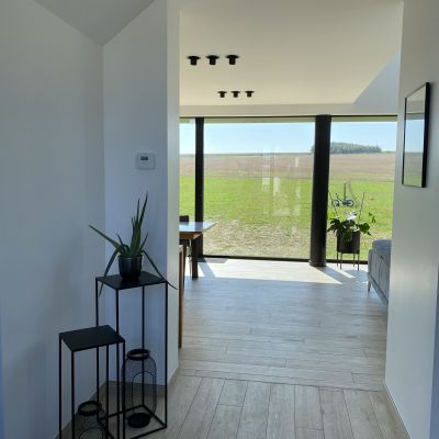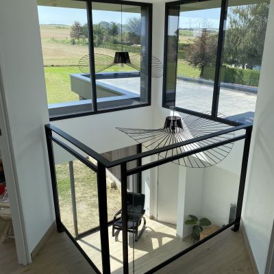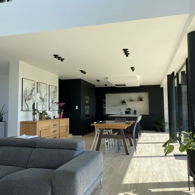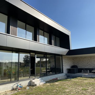 Le projet est plus fermé côté nord avec des ouvertures plus modestes contrairement à la façade côté jardin (sud) qui profite d’une baie de 12 mètres par 2.50 mètres de hauteur.