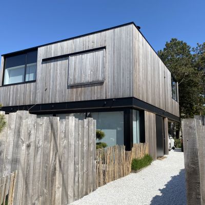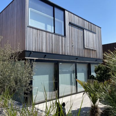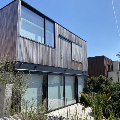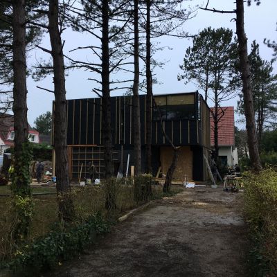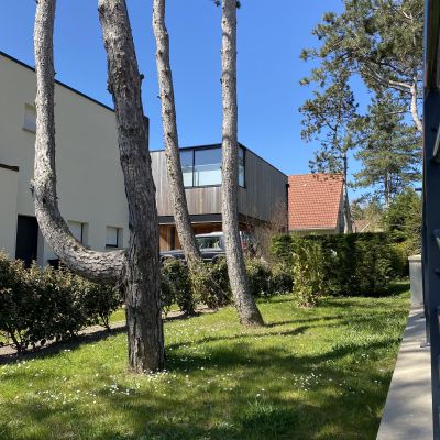 Dans un cadre verdoyant de la côte d'opale, intégration d'une maison individuelle à ossature bois et grandes baies vitrées.